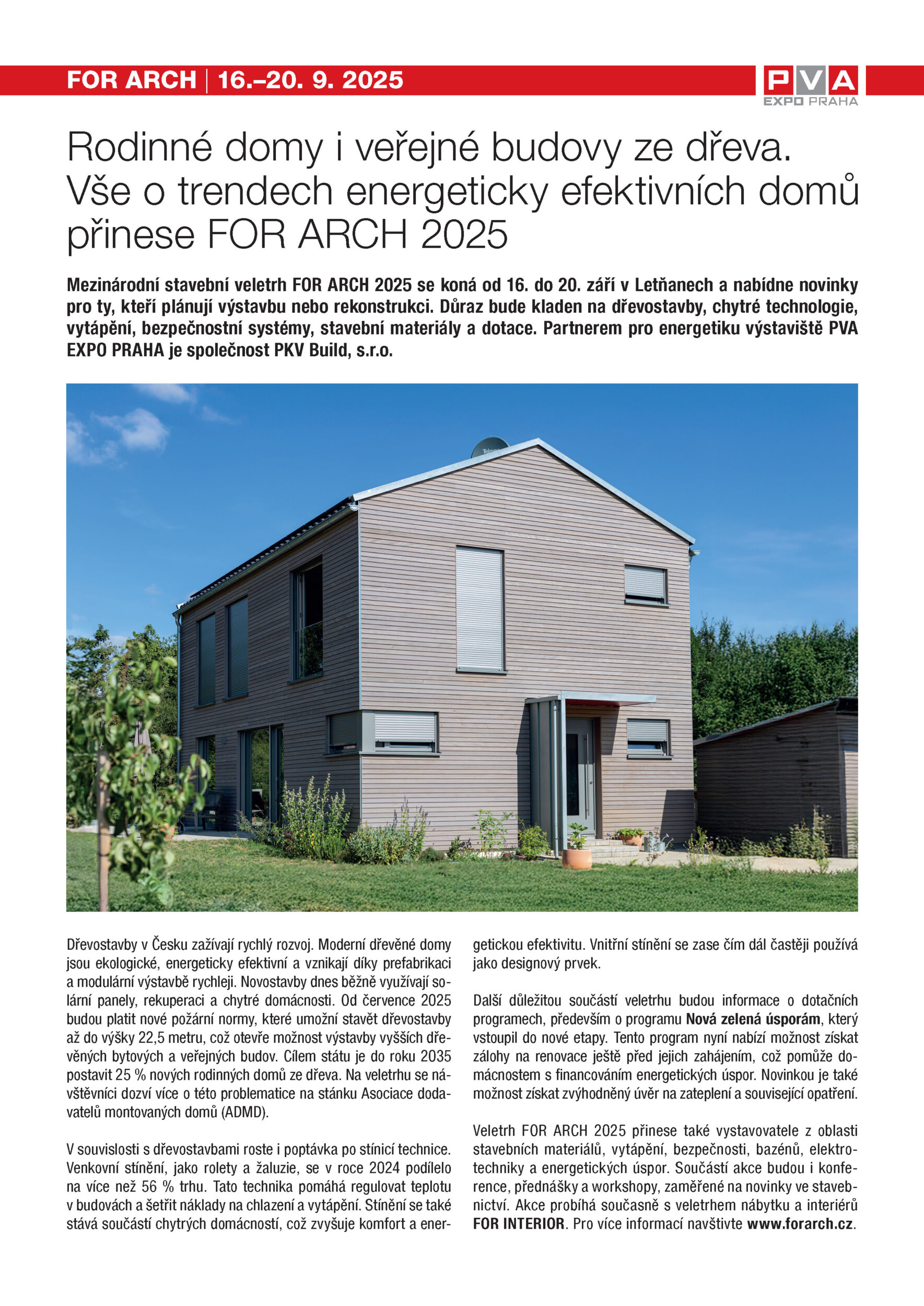 Své produkty, technologie a inovace představí na veletrhu nejvýznamnější tuzemské i zahraniční společnosti také z odvětví stavebních materiálů a stavebních prvků, dřevostaveb, bazénů, elektra a zabezpečení, energetických úspor či dotací. Doprovodný program přinese také konference, přednášky či workshopy pro profesionály i pro širokou veřejnost. Více informací o veletrhu najdete na www.forarch.cz.