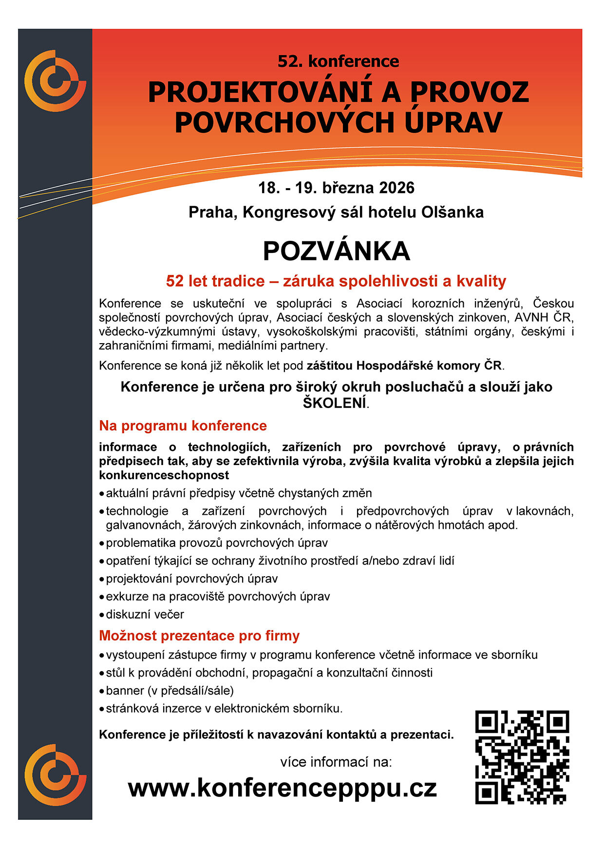 Konference se připravuje opět ve spolupráci s Asociací korozních inženýrů, Českou společností povrchových úprav, Asociací českých a slovenských zinkoven, vědecko-výzkumnými ústavy, vysokoškolskými pracovišti, státními orgány, zástupci českých i zahraničních firem a mediálních partnerůse zohledněním všech podmínek podle epidemiologické situace.